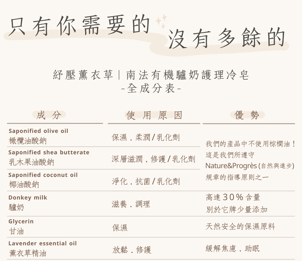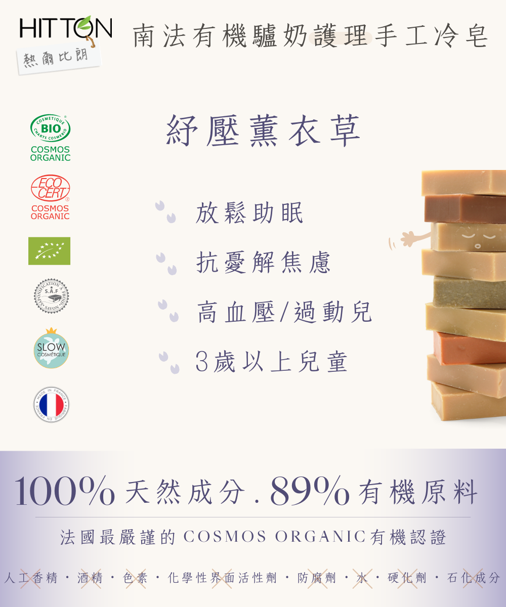 產品特色: 讓人放鬆愉悅的薰衣草精油,混入30%有機