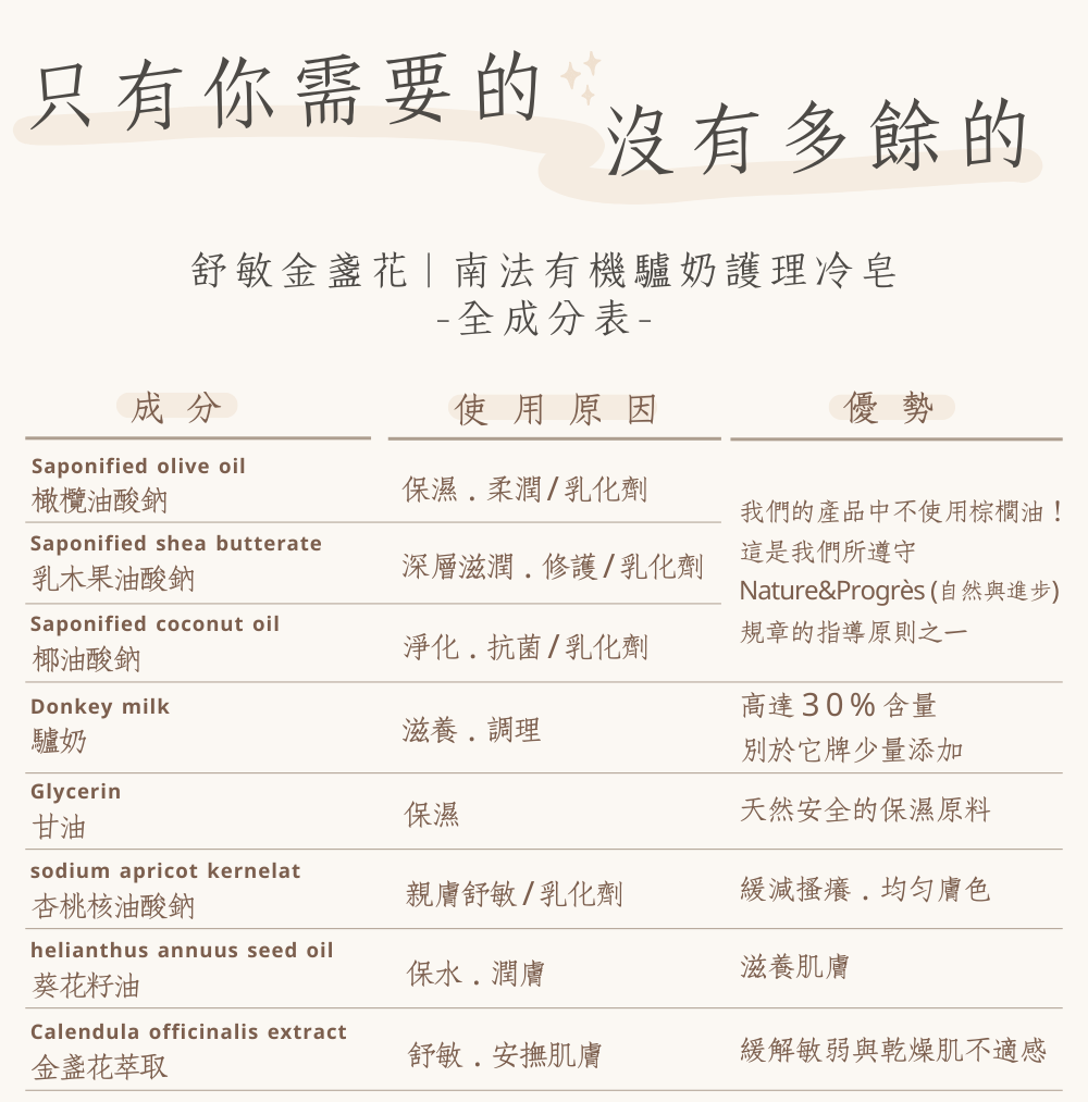 產品特色:本款不含精油,金盞花富含強大抗炎特質