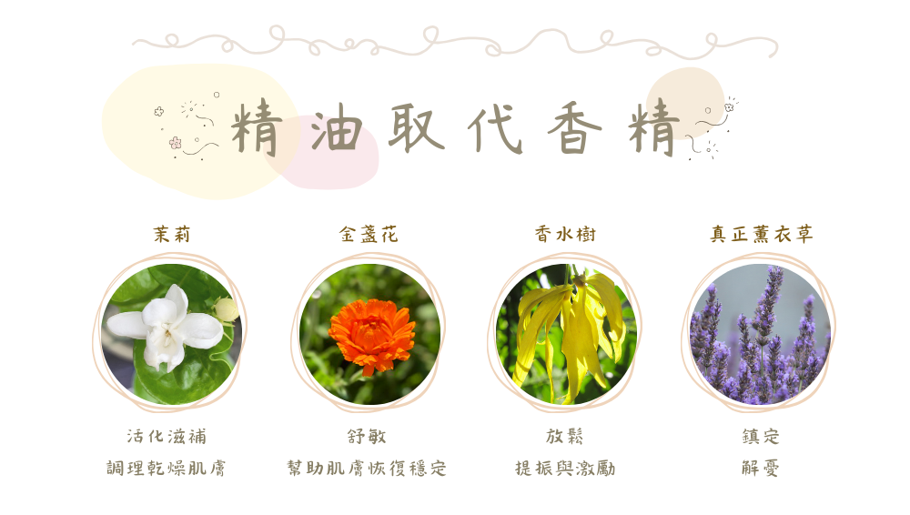 天然有機茉莉、真正薰衣草、伊蘭伊蘭、金盞花精油;