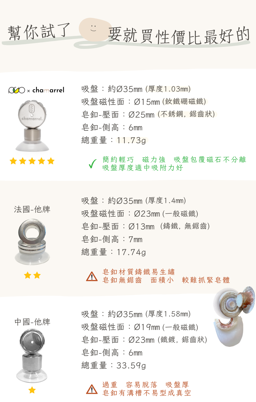 吸盤尺寸: 吸盤面 3.5 cm x 上方磁性釦面 1.5 cm